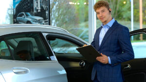 KFZ-Gutachter prüft Fahrzeug und füllt ein Formular aus